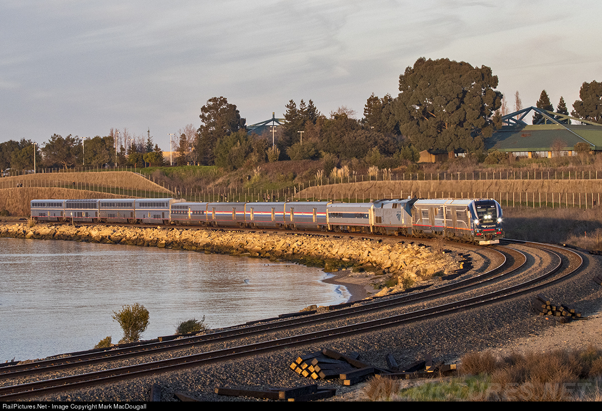 | Amtrak extra 963 rounds the bend in fading light along San Pablo Bay at Hercules on the UP Martinez Sub. A couple Illinois DOT Chargers are leading a P42 and a diverse consist of Amtrak equipment on a long distance test trip of the Chargers. This segment ran between Seattle and Oakland. |