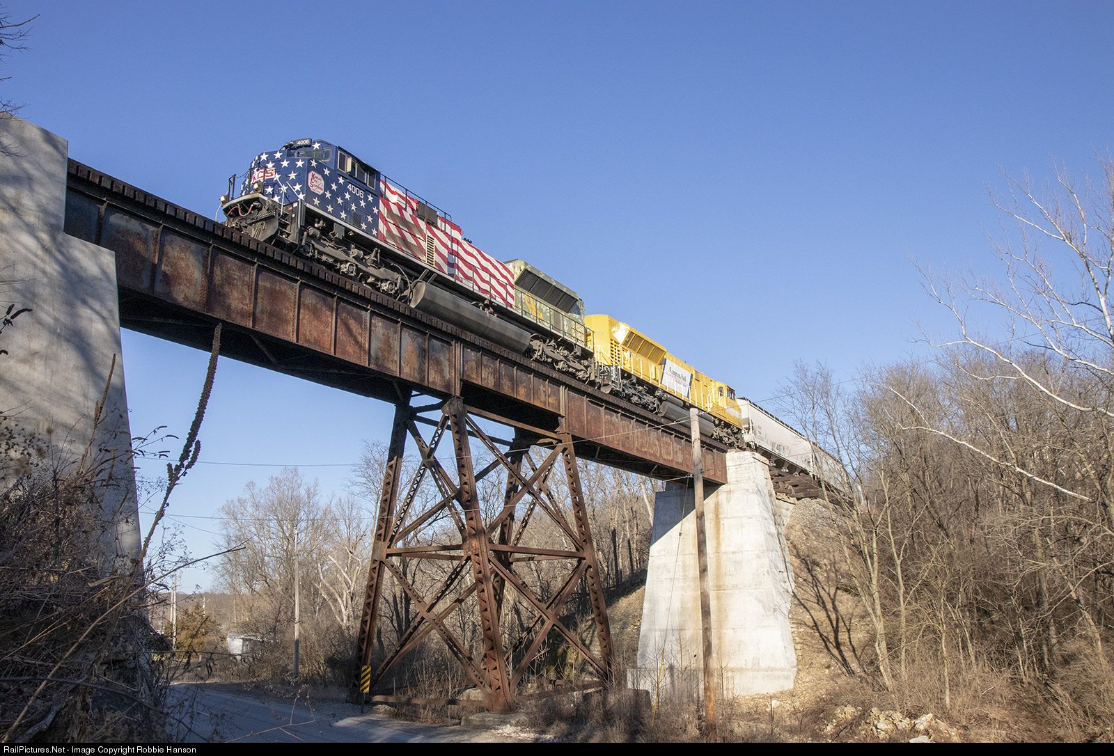 KCS 4006 leads a westbound manifest over a tall trestle just east of Bowling Green, MO. As the trailing leaser SD70ACe-T4 was offline, this was a long slow climb out of the river bottom and the crew tied up in Arthur, east of their typical crew change point at Mexico, MO.