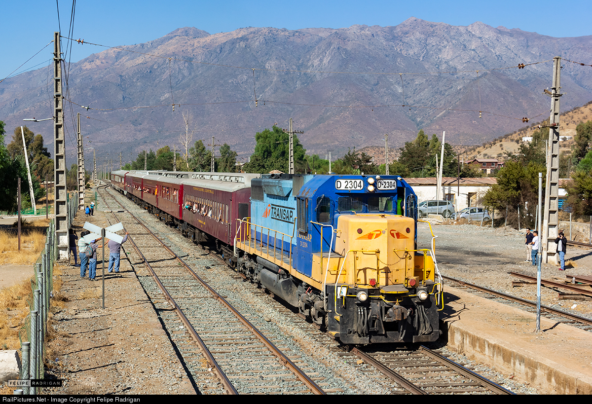 Led by Transap's D-2304, the "Expreso del Recuerdo" heritage train stops on the main line of Til Til station waiting for the authorization to move on. Just behind the convoy it is possible to see the "Altos de Chicauma" hill, which marks the division between the Metropolitan and Valparaiso regions. From this point onwards, until Summit station, the train must fight against the steep slopes that characterize this route, which forced its electrification in the early 1920s.
