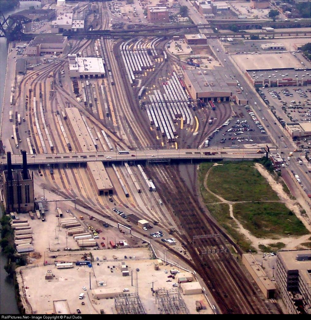 | View of the Amtrak and Metra yards from atop the Sears Tower. Amtrak is on the left, Metra on the right. The bridge going over the tracks is Roosevelt Ave. |