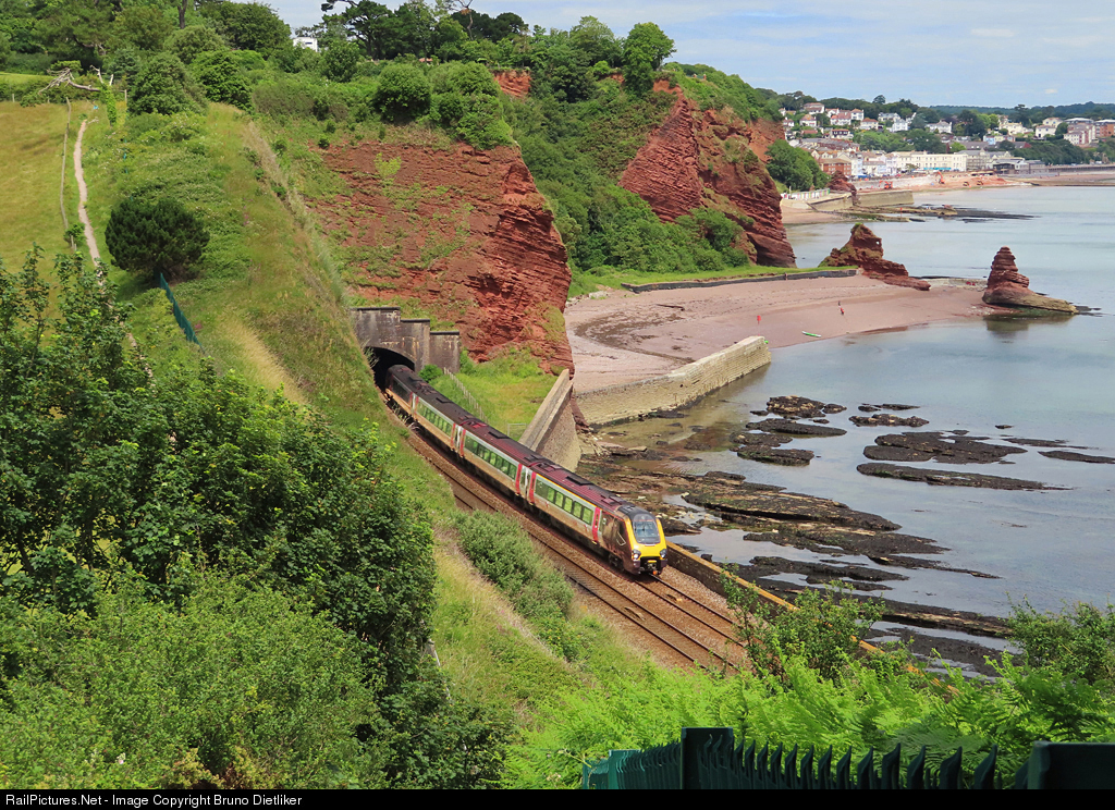 | CrossCountry in a short part between two tunnels between Dawlish and Teignmouth in a beautiful landscape. In the background on the right side the station Dawlish. On the path on the left side there are many foto locations for watching trains |