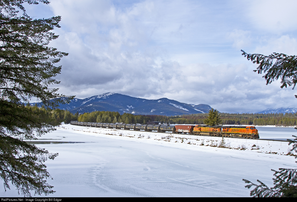 | BNSF 7640 leads an empty oil train east across the causeway that separates the Clark Fork from a frog pond in the foreground near Trout Creek, MT. The train is a Montana Rail Link train running from Hauser, ID to Missoula, MT and eventually to Laurel where it will go back to BNSF. |
