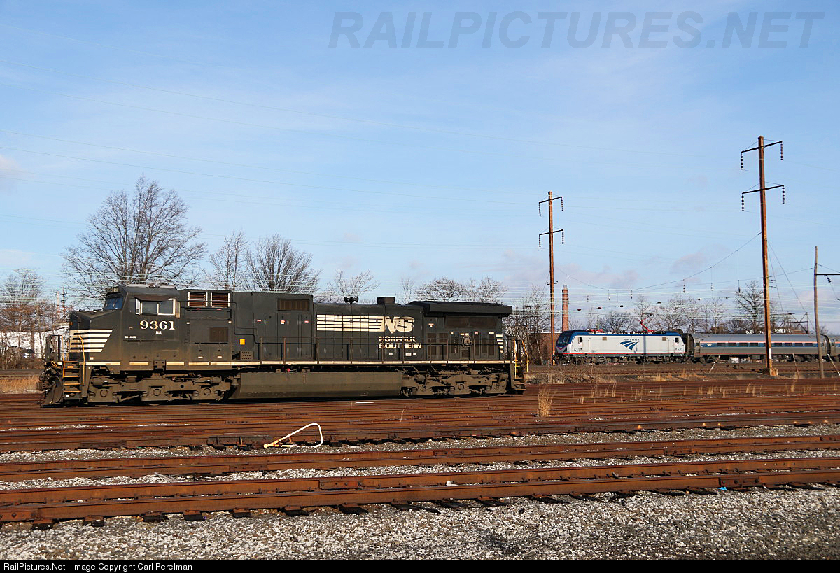 NS C44-9W 9361 is parked at the former Conrail Styles Street Yard while an Amtrak Keystone Service flies by. The 9361 contains Santa Fe style number fonts, since it was rebuilt by the BNSF after a wreck at Pauls Valley, Oklahoma on December 30, 2003.
