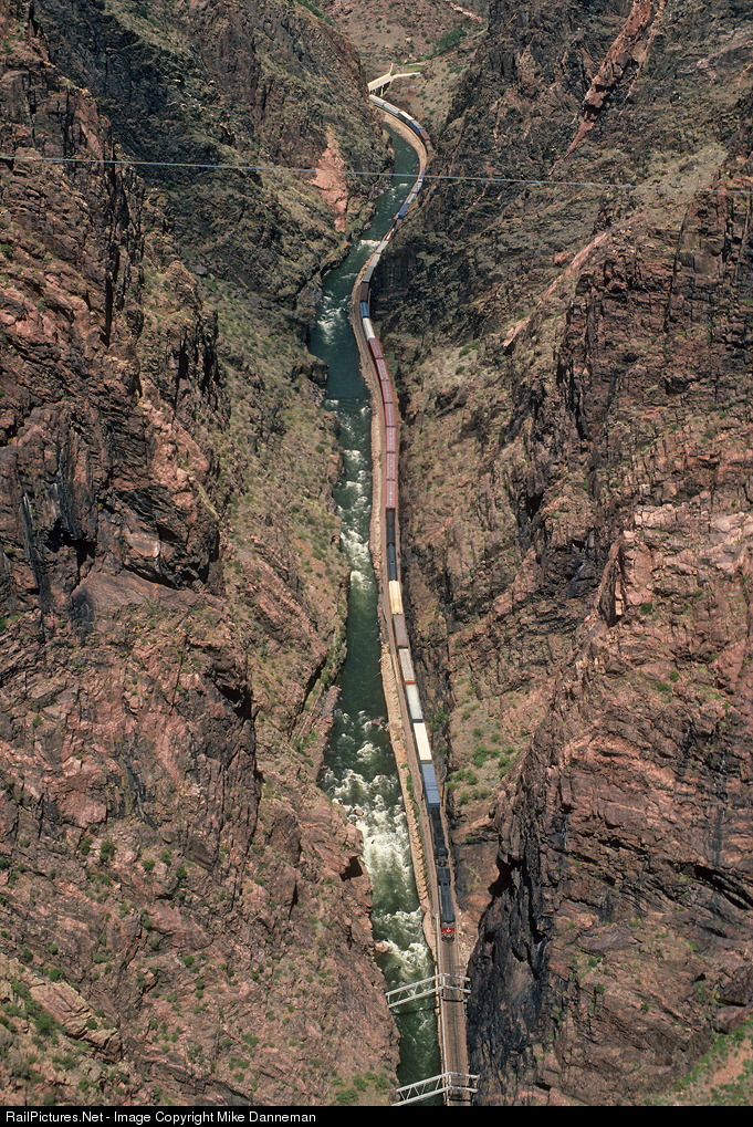 On July 26, 1996, an eastbound Southern Pacific freight follows the Arkansas River as it negotiates the rugged and rocky confines of the Royal Gorge west of Cañon City, Colorado. Just ahead of the train visible at the bottom of the scene is Hanging Bridge which is the narrowest portion of the chasm.