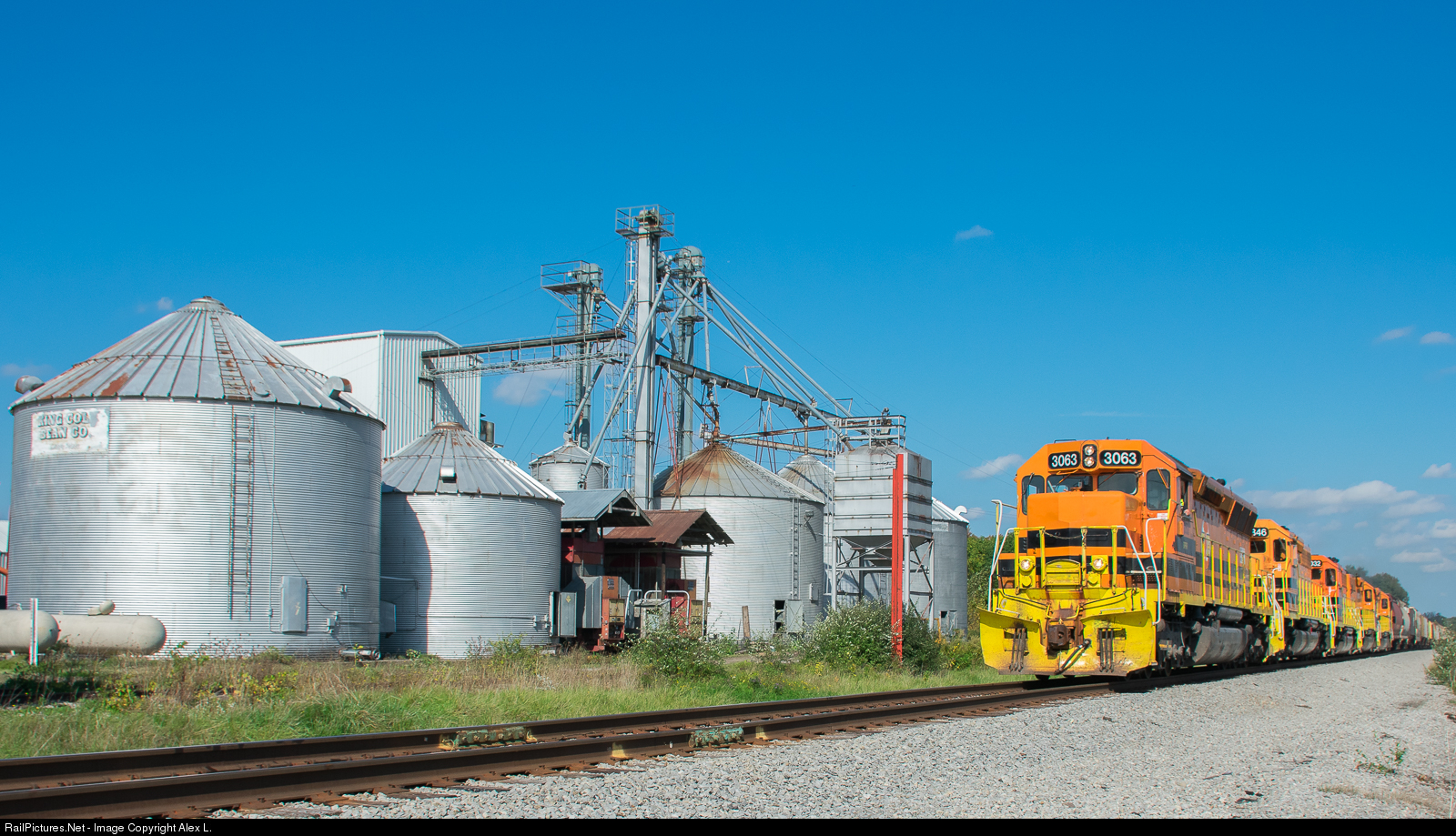 BPRR 3063 heads up an empty salt train as it passes a collection of grain bins in York NY.