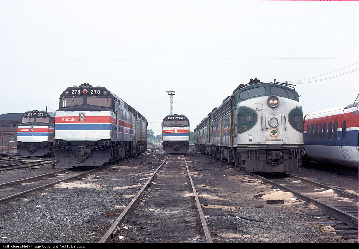 Power for Southern Railway's Crescent sits among Amtrak power in the Ivy City engine terminal. Visible are Amtrak F40's 275, 278 (MU'ed with SDP40F 606), and 285, Southern Railway 6910, and a stored UA Turbo Train.