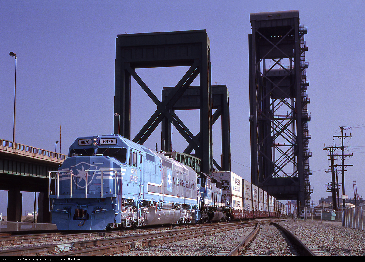 Unofficial MAERSK publicity train ran at request of MAERSK photographer posing at CP Badger on PHL Alameda Corridor Sub with Badger (railroad) and Commodore Heim (auto) bridges in background. The unit was painted by BNSF at MAERSK request for grand opening festivities of new MAERSK Pier 400 facility, at the time, largest on dock container facility in the world.