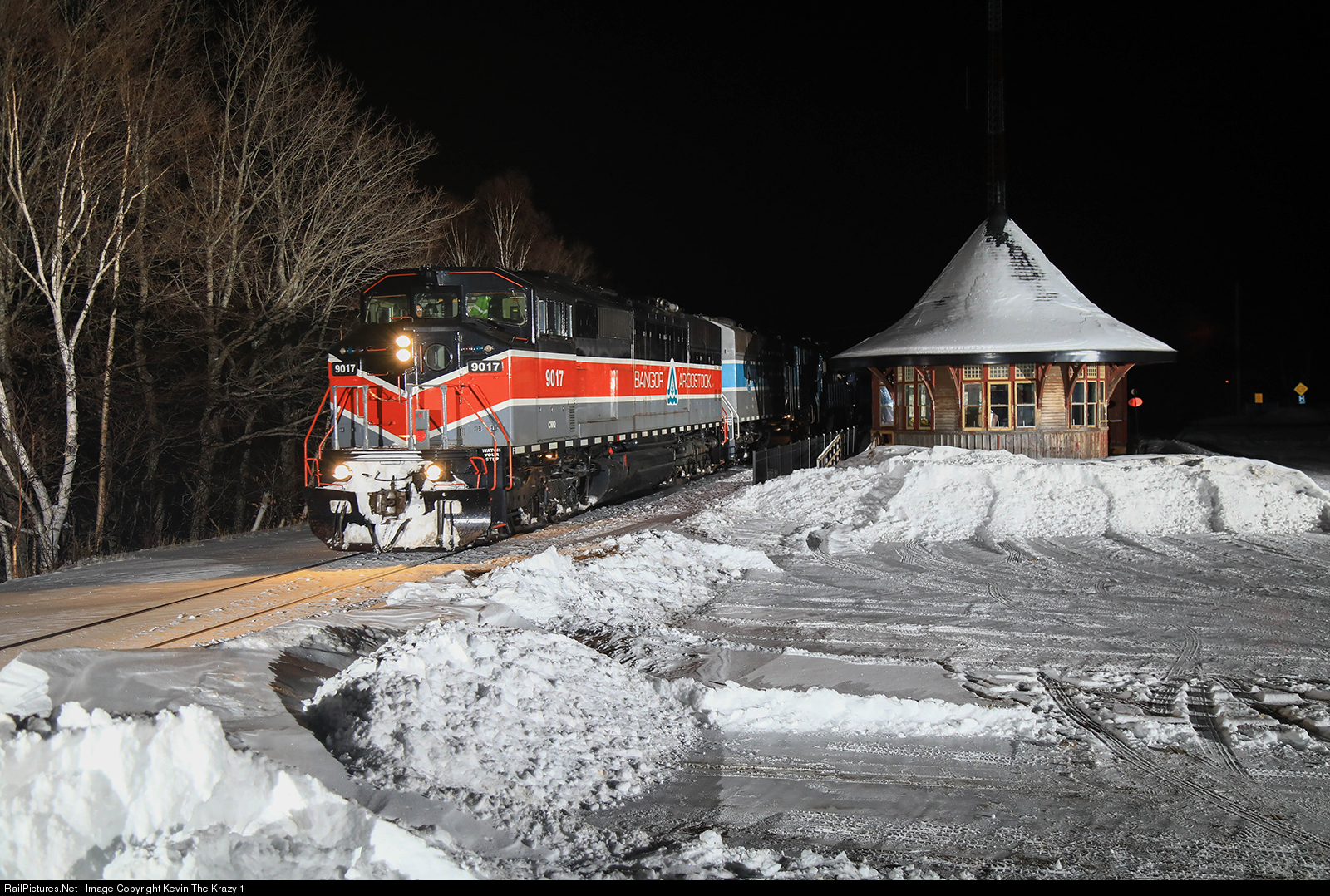 After patently waiting for 4 hours, CMQ Job #1 passes the depot in Greenville at 2131hrs with the Bangor & Aroostook heritage unit doing the honors tonight.
