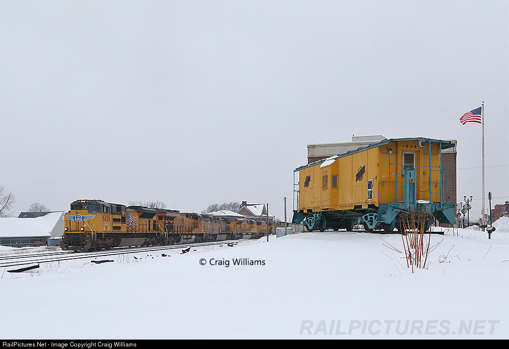 | Traffic was light on the UP's Clinton Sub as we only seen 7 eastbounds between 12-5pm, and **NO** westbounds this day. The Council Bluffs to Proviso junker that has a bunch of power as they move east. The train passes one of the neat things on display in Belle Plaine this ex-CN&W caboose. |
