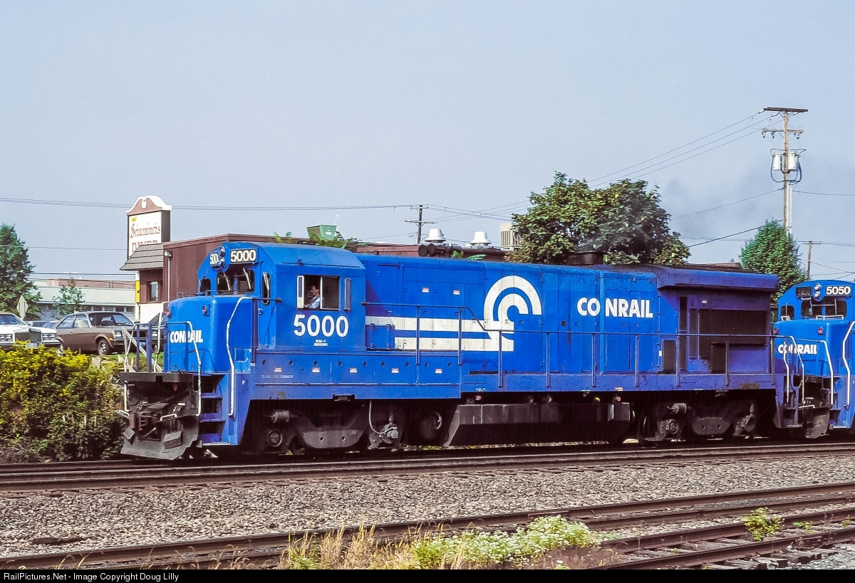 | Conrail B36-7 “class unit” 5000 leads a westbound mail train through Belt Line Junction, Pennsylvania. The B36-7’s immediately replaced GP40-2’s as the preferred power for hot intermodal trains when delivered in 1983. By this time, six-month old B40-8’s were bumping B36-7’s from some of these assignments. |