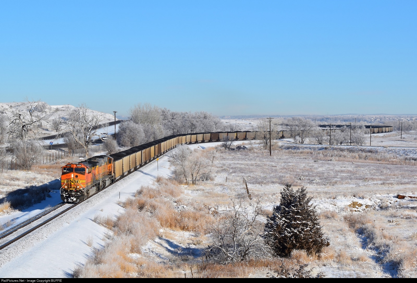 | A fresh layer of snow from the previous day has blanketed the Colorado Front Range, making the orange paint of BNSF 5838 (AC4400CW) stand out as it leads a loaded coal through Fountain, Colorado. |