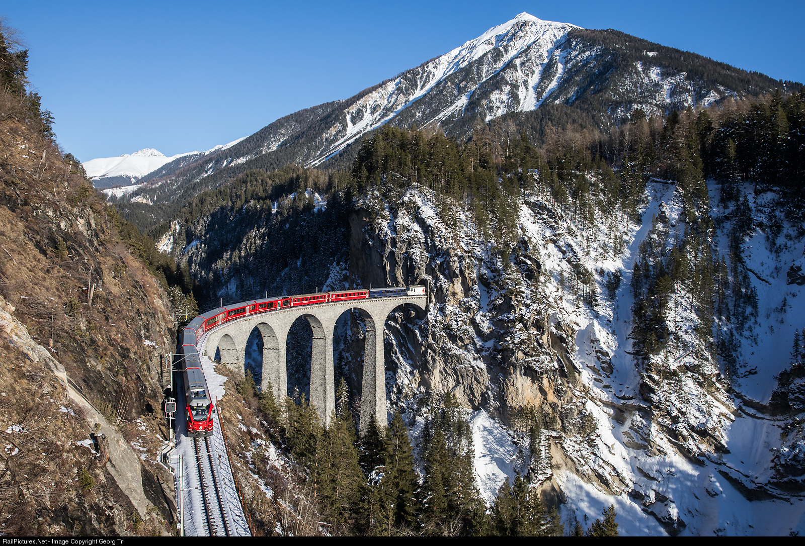 Interregio 1152 of the Rhaetian Railway from St.Moritz over the Albula line to Chur is crossing the 65 meter high Landwasser viaduct, landmark of the UNESCO World Heritage Albula Bernina. Leading is first class cab car At # 57804, followed by the permanently coupled 6 car ALVRA trainset, two second class standard cars type II as reinforcement and a blue GOURMINO dining car. The locomotive Ge 4/4 III # 643 in the EMS publicity paint scheme in the rear of the train is just leaving the 216 meter long Landwasser tunnel. The white sugarloaf mountain is the 2622 meter high Muchetta, on th left in the background is the Leidbachhorn near Davos.