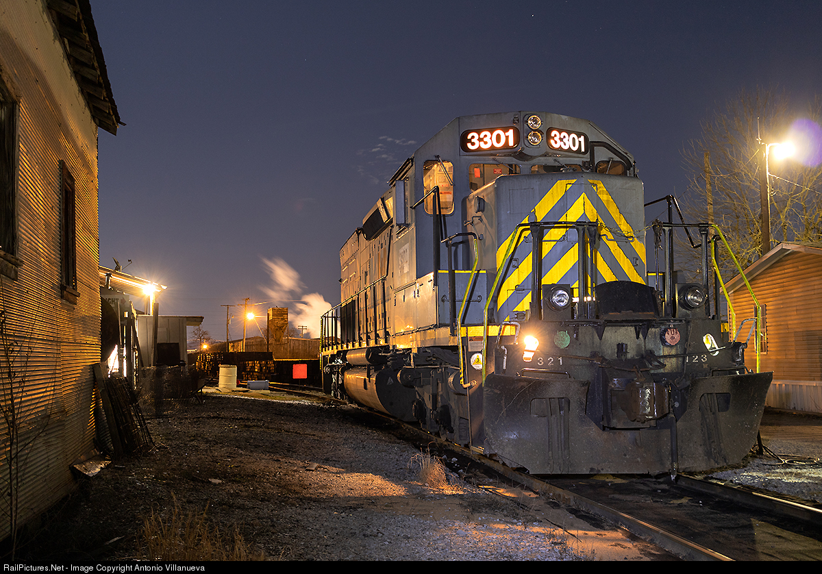 | The Batesville switcher is tied down for the night with Ex-KCS tunnel motor number 3301 assigned to the job. This locomotive is a newcomer to the M&NA, only being transferred to this line a few weeks ago. |
