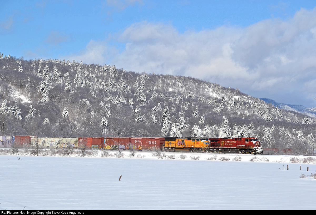 Canadian Pacific train 252 barrels along through a fresh snowfall with a nice CP UP combo on this bright frigid winter day.