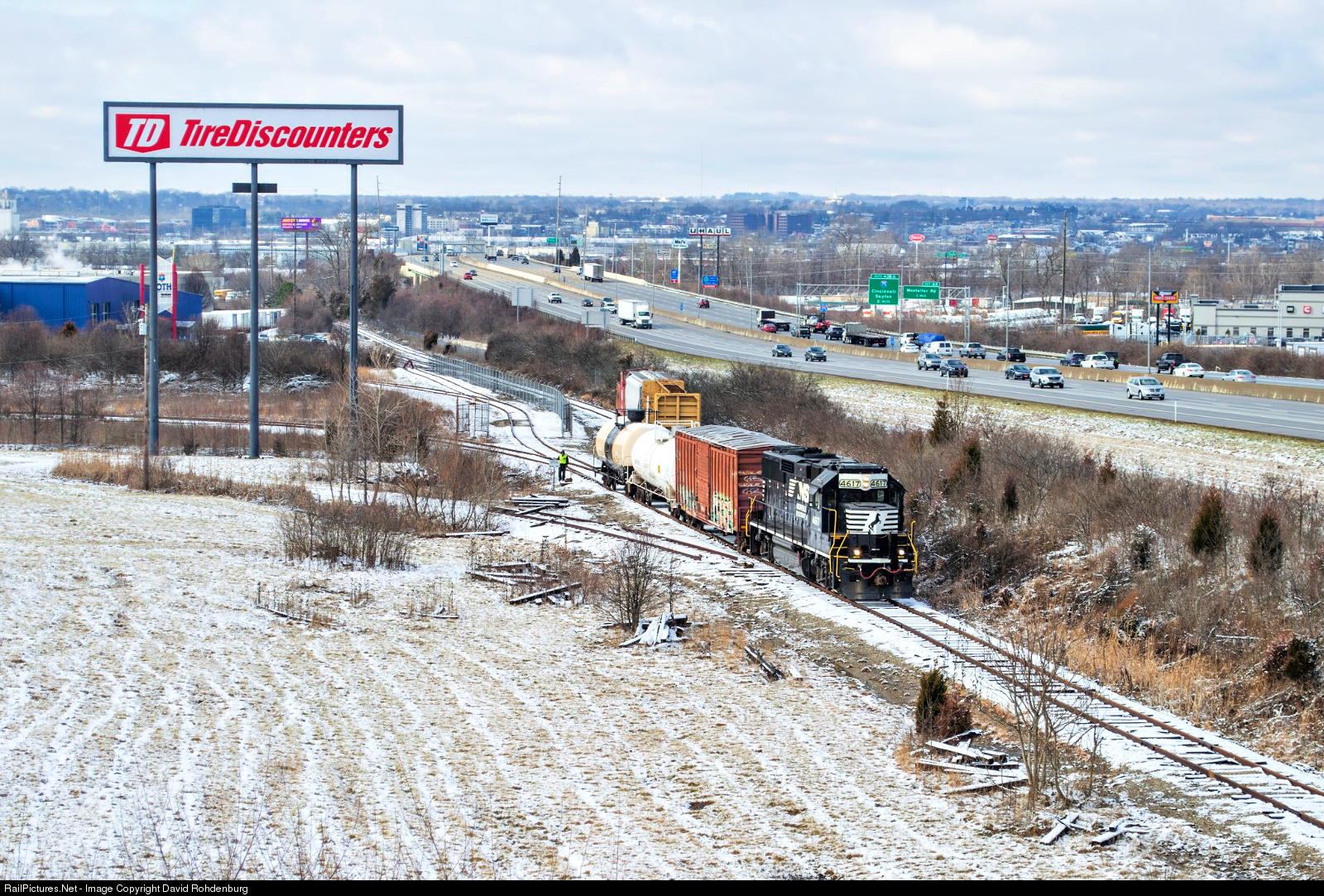 | A large Tire Discounters billboard dominates the scene as Norfolk Southern local freight T02 switches some tank cars for DuBois Chemicals with EMD GP59 No. 4617 on an industrial spur off of the NS Dayton District along I-275 in Sharonville, Ohio. A snowy Friday morning has begun to turn into a sunny February day as the crew goes about their work. |