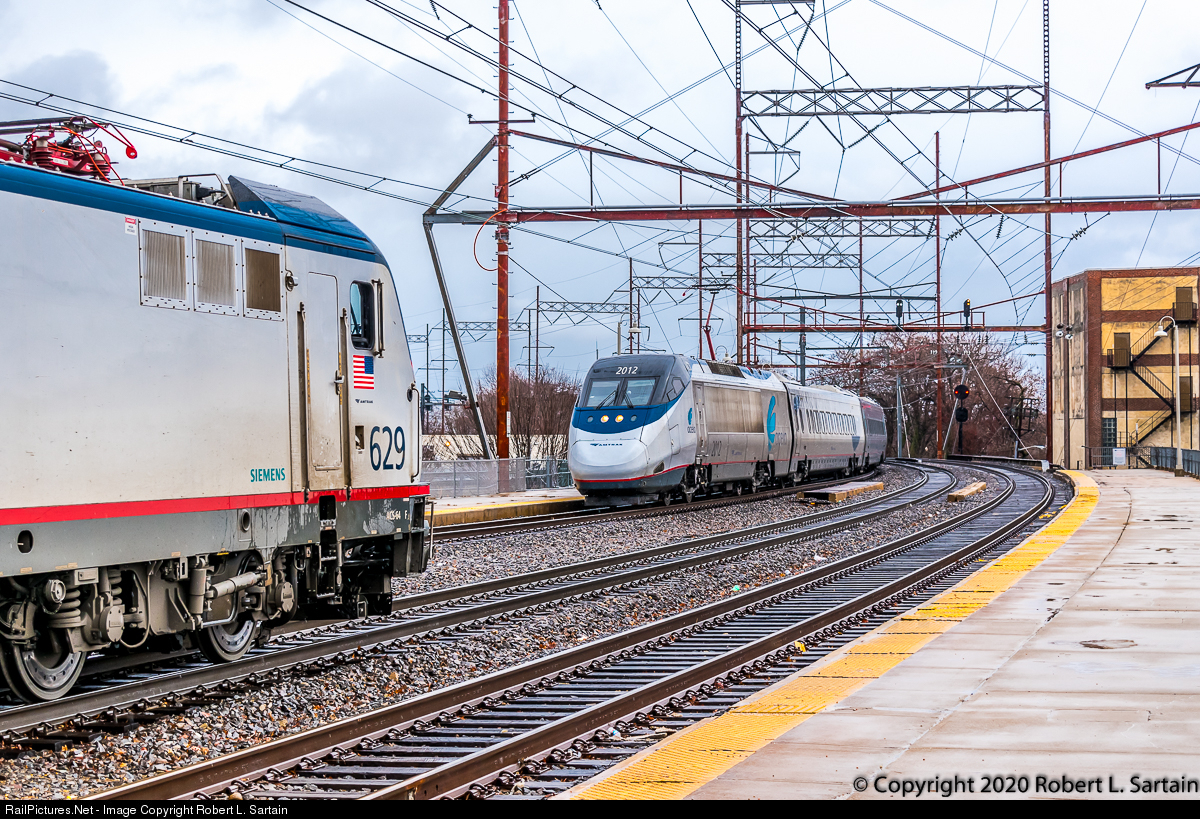 | A day in the life of the Northeast Corridor. Acela 2151 pulls into Wilmington, Delaware on three track behind power car 2012 as Northeast Regional 86 departs on two track with Siemens ACS-64 629. The signals for WINE interlocking are in the distance. |