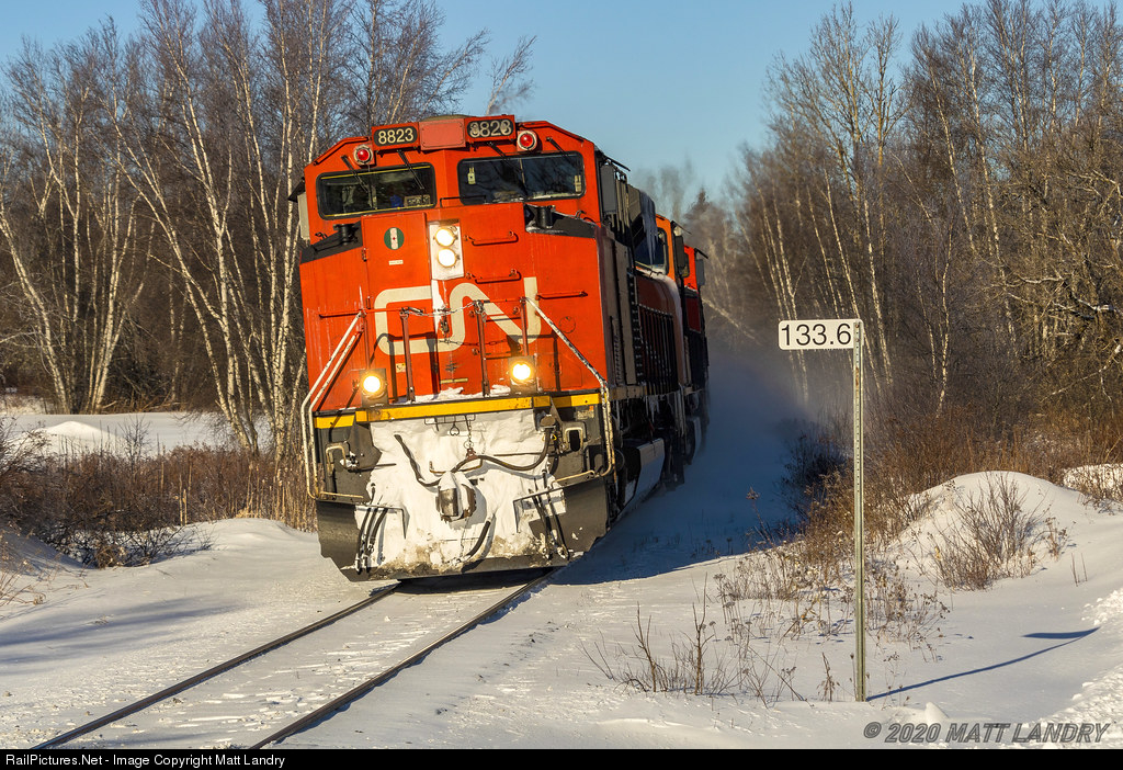 Four engines, and only one working to full capacity, train 120 rounds the bend at Berry Mills, New Brunswick. This train is much shorter than usual, at around 6,500 feet. This is due to the protests which are occurring on the CN's Kingston Sub. This train originated in Joffre, PQ, instead of Toronto, Ontario.