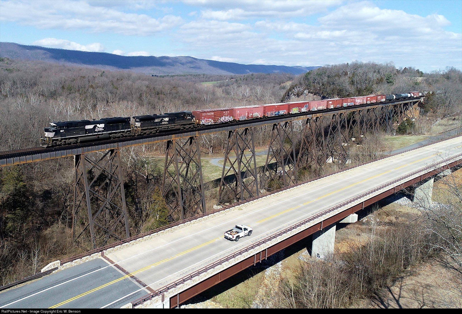 NS 15T comes southbound over the high trestle at Compton, VA. The train will hold the main and pass 18T at Vaughn-Summit.