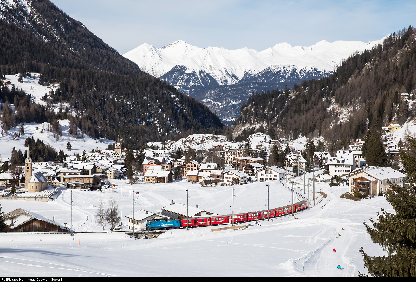 The empty sledgers train 8834 from Preda down to Bergün is nearing the destination, to bring up another "load" of sledgers uphill. Ge 4/4 II # 619 in the blue publicity paint scheme for the Südostschweiz (newspaper) is shoving the baggage car D # 4231 (built 1969), the lightweight "bycicle" cars (now used for the sledgers) WS # 3914, 3911, 3913 (all built 1956) and cab car BDt # 1723. The sled run from Preda to Bergün is very popular, but the most challenging and fast sled run is from the Darlux mountain (right foreground, but this part is easy..)