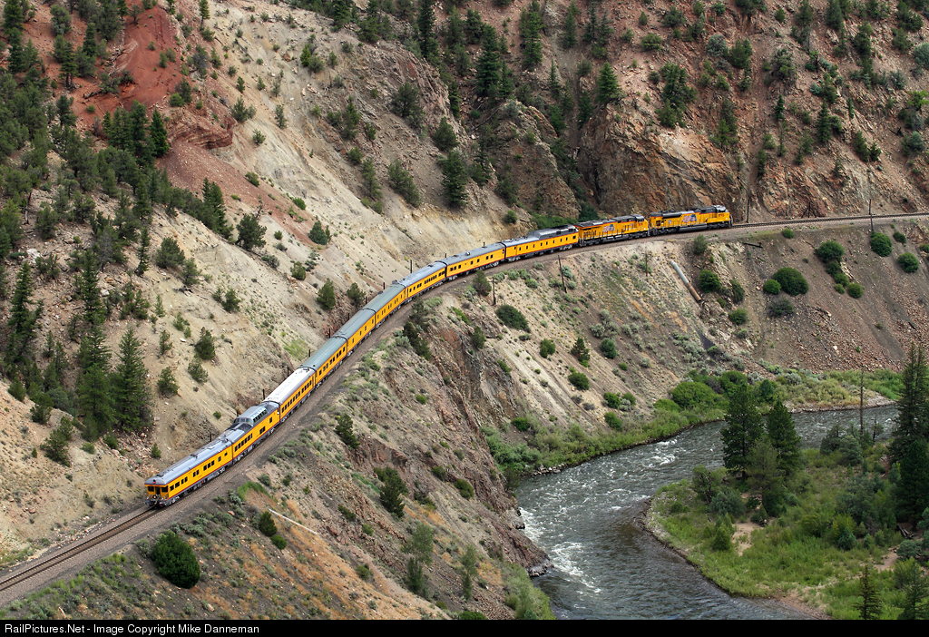 See beautiful diesel locomotives in UP's traditional armour yellow livery and special commemorative paint schemes pulling long trains of yellows cars reminiscent of the days when UP domeliners seemed to go Everywhere West.