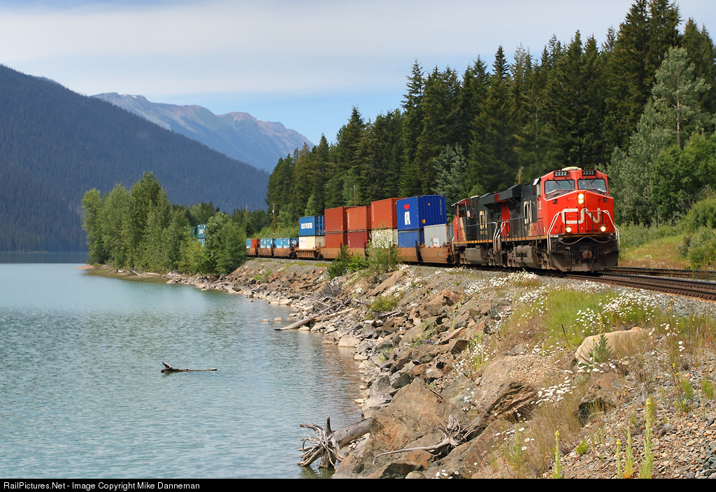 | Canadian National intermodal train 102 zips along the shore of Moose Lake, British Columbia, on July 17, 2013. |