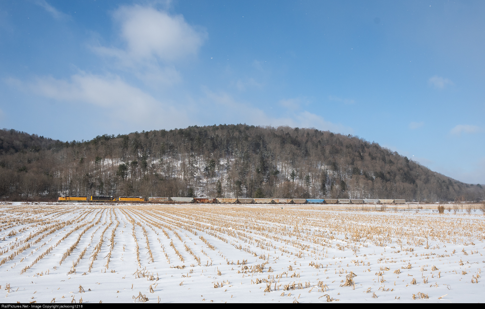 | On a sunny January day, the three units assigned to WATCO's Ithaca Railroad haul 15 loads of salt southbound for interchange with Norfolk Southern in Sayre, PA. The train is seen here just north of Spencer, NY passing between the base of a hill and snow covered farm fields. |