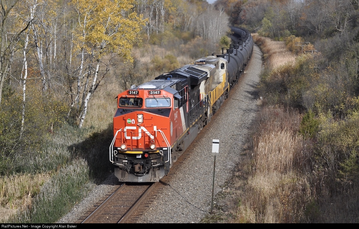 | Southbound CN oil loads move through a slight curve just north of Slinger, WI, assisted by a Citi lease unit. |
