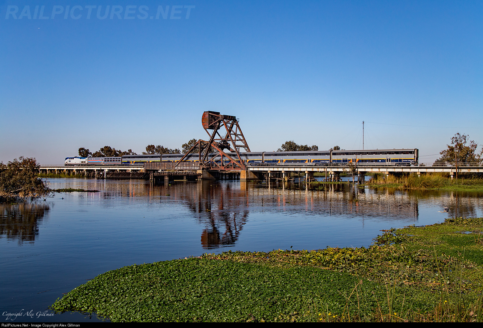 | Things appear to be almost normal this afternoon as Amtrak 712 hustles across one of the rust-colored spans here at Orwood. Almost normal, because if one looks closely between the P42 shoving on the rear and the normal Amtrak California bi-level cars, a brand new Viewliner dining car can be seen along for the ride to Bakersfield. The odd placement of this and other Viewliner series cars came in late 2019 when BNSF began requiring Amtrak trains to have a specific amount of axles to ensure grade crossing circuits would be properly triggered. |
