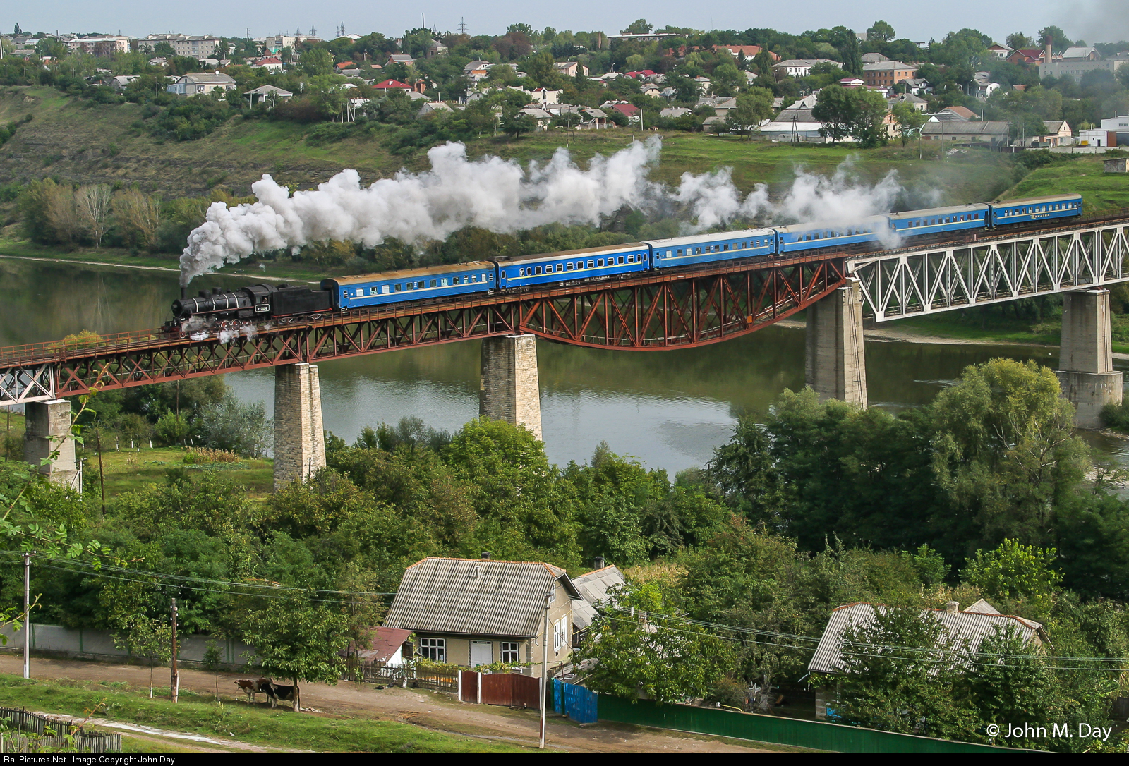 Crossing the Dneister Canyon, now designated a National Nature Reserve, is 1944-built ALCO 2-10-0 Yea-2026, hauling the rather brightly painted sleepers and dining car that made up the Dzherelo train.