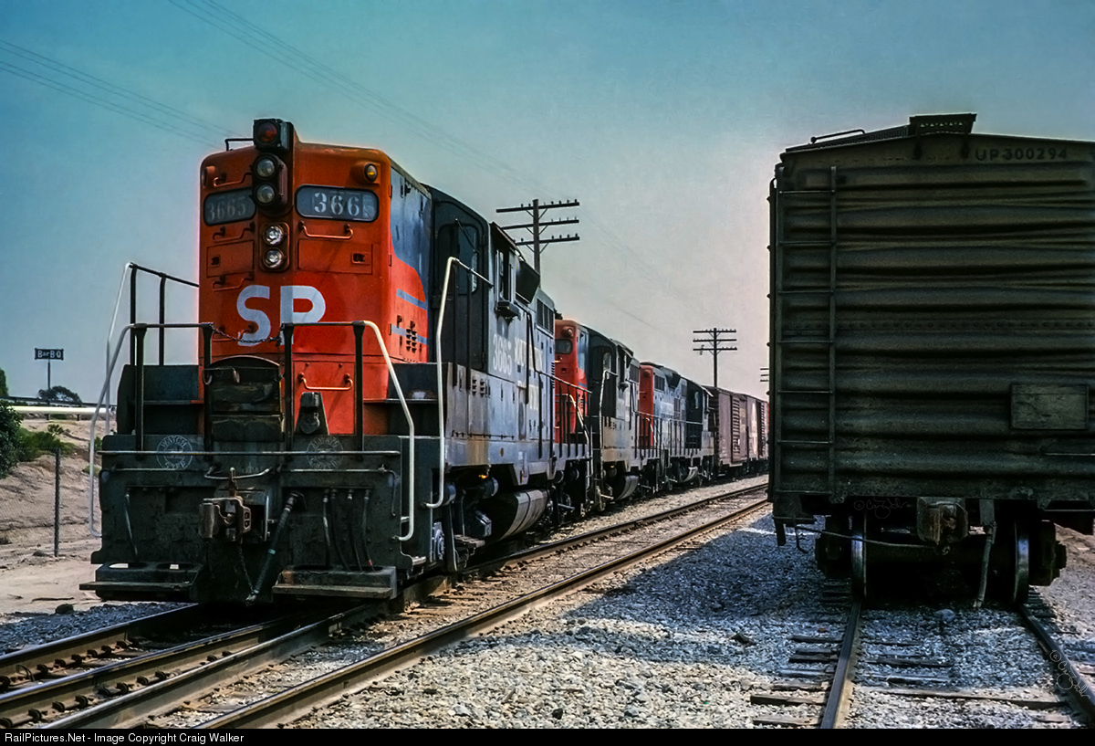 Southern Pacific’s Buena Park Local, having picked up a cut of cars (40’ box cars!), departs Buena Park, California, in April 1973. A trio of GP9s, of which SP owned over 300, are up front – SP 3665 (ex-SP 5802), 3707 (ex-5844) and 3542 (ex-5710). Lead engine 3665, built by EMD in March 1959, will get rebuilt in two years, emerging from the railroad’s Sacramento Shops as SP GP9R 3818.