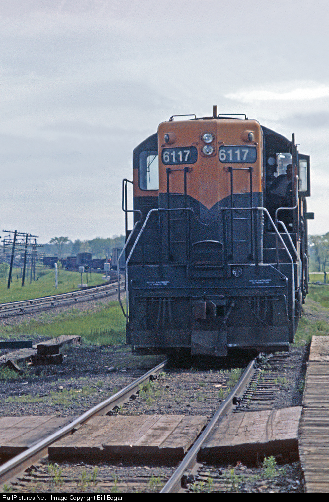 BN 6117, former Great Northern SD9 no. 590, sits at Brook Park, MN. The engineer is relaxing in the cab while the morning Badger arrives and lets off a couple passengers on its way to Duluth. In the background a Duluth bound freight also waits for the passenger train to pass by. BN 6117 is the Brook Park turn from St. Cloud and will finish interchanging cars with the freight, then head west back to St. Cloud via Mora and Milaca. The loco is set up to run long hood front, thus the engineer sitting where he is.