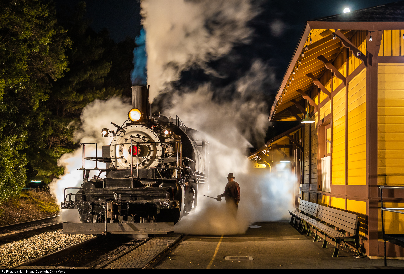 | Clover valley Lumber Co. 2-6-6-2 Tank Engine sets up under a full moon at the restored Southern Pacific Depot as part of the Pete Lerro Productions Photo Shoot of the Niles Canyon Railroad. Congratulations to the all volunteer Niles Canyon Railroad people for putting in a long day and seeing that everybody had a good time and for putting on a great show. |