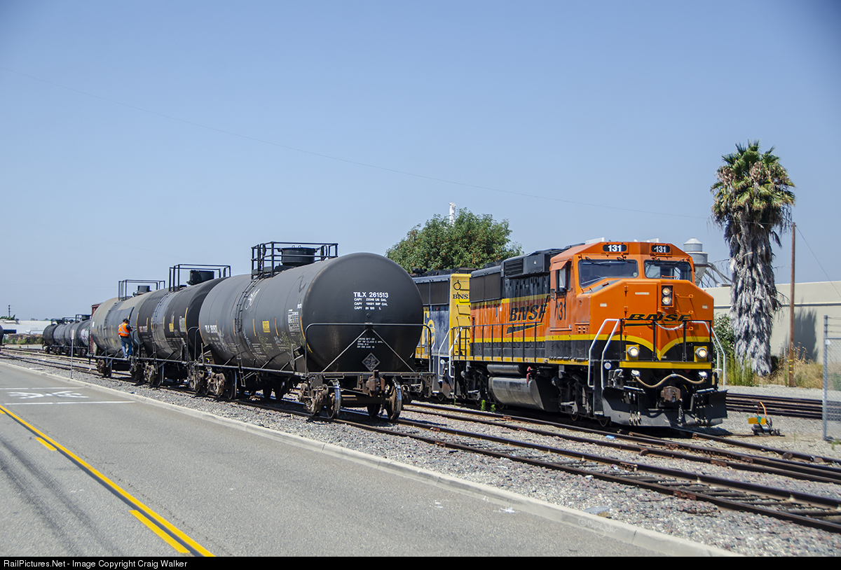 A cut of three tank cars rolls by the locomotives of BNSF local L-CAL0081-12, the Second La Mirada, as the crew performs a "flying switch" move. The engines needed to get on the east end of these cars, and so they uncoupled on the move and then sped up to get ahead of them. Meanwhile, the switchman threw the switch after GP60 196 and GP60M 131 passed by, allowing the tank cars to roll past while the brakeman riding aboard them set the brakes once they were where they wanted them. Now the power will head east again, and back onto the tank cars (with BNSF 131 on the point) off BNSF’s Kimberly Lead and back onto the mainline (in this case, Metrolink’s Orange Sub) once again, then reverse direction yet again and head about a mile further to the BNSF’s San Bernardino Sub and then continue back to the yard in La Mirada. (Fullerton, California – August 12, 2019)