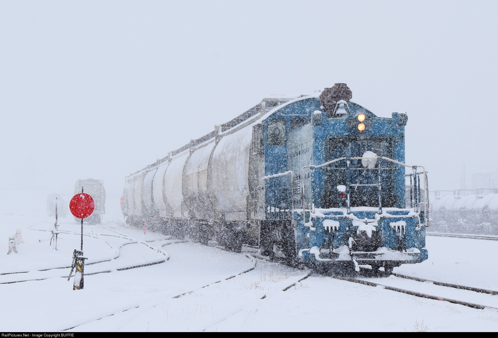 | Even in the worst of blizzards Con Agra' SW1200 needed to keep shuffling grain cars in the small Commerce City yard. The fast falling snow made for a miserable afternoon of cleaning switches and trying to keep warm. |