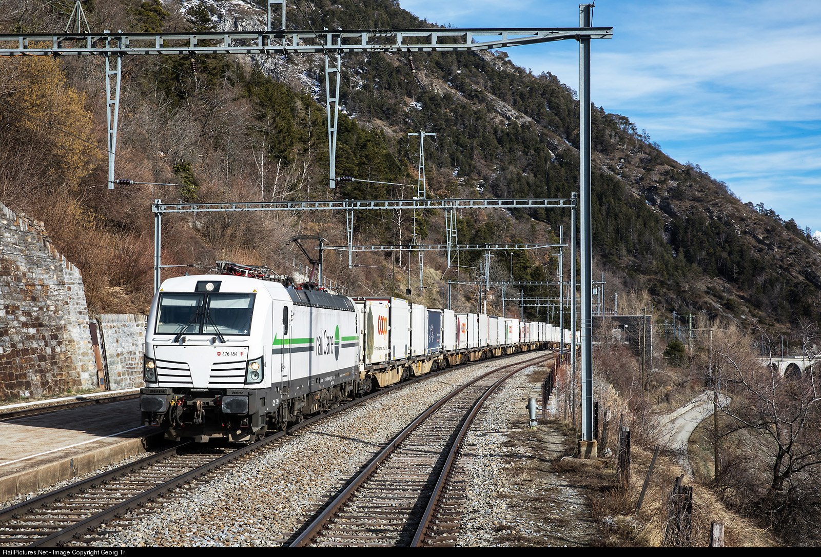 | Siemens "Vectron" Rem 476 # 454 of the RailCare is pulling the container train 63688 from Brig over the Lötschberg mountain line to Niederbottigen through Hohtenn. |
