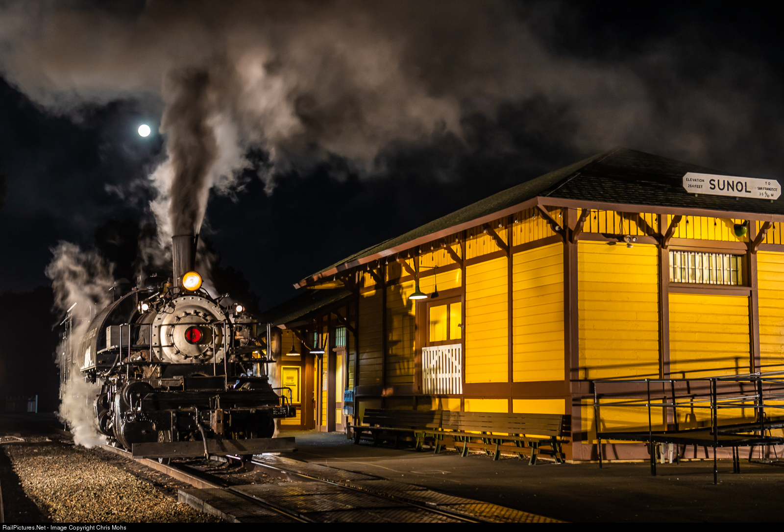 Clover valley Lumber Co. 2-6-6-2 Tank Engine sets up under a full moon at the restored Southern Pacific Depot as part of the Pete Lerro Productions Photo Shoot of the Niles Canyon Railroad. Congratulations to the all volunteer Niles Canyon Railroad people for putting in a long day and seeing that everybody had a good time and for putting on a great show.