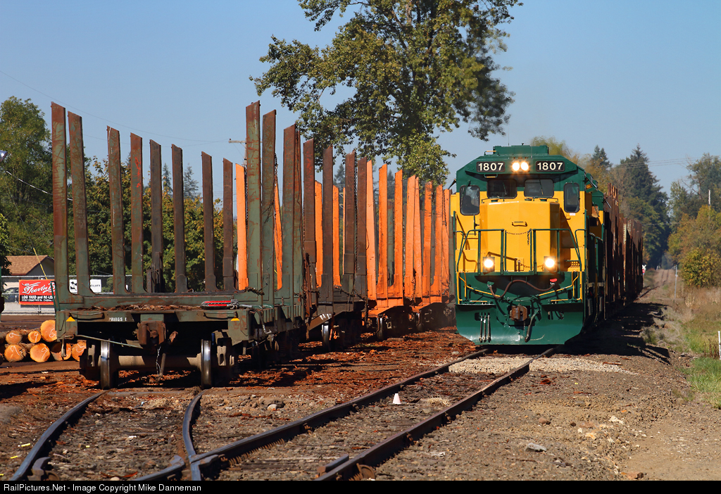 Powered by a pair of GE B40-8s, an Albany & Eastern log train has just exchanged empties for loads at the Teevin Bros. log yard and reload facility at Crabtree, Oregon, and is departing for Lebanon on September 26, 2016. AERC No. 1807, recently painted in May 2016, is a former Southern Pacific unit, while trailing unit No. 1841 is ex-Cotton Belt.