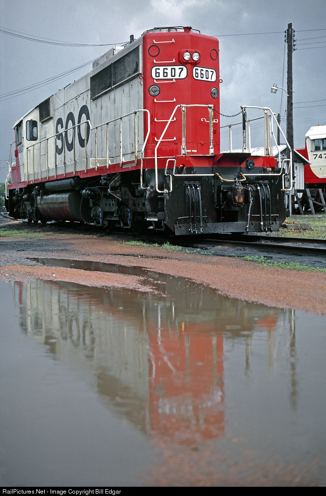SOO 6607 reflects on its future after a thunder shower at Stevens Point. This important Soo Line operating hub would undergo numerous changes within the next year, first becoming Lake States Transportation, then on Oct. 11, 1977, becoming a vital part of the new Wisconsin Central, and finally in 2001 becoming a key link in Canadain National's expansion into the United States. Soo opted for Milwaukee's main along the Mississippi River, now a part of CP.