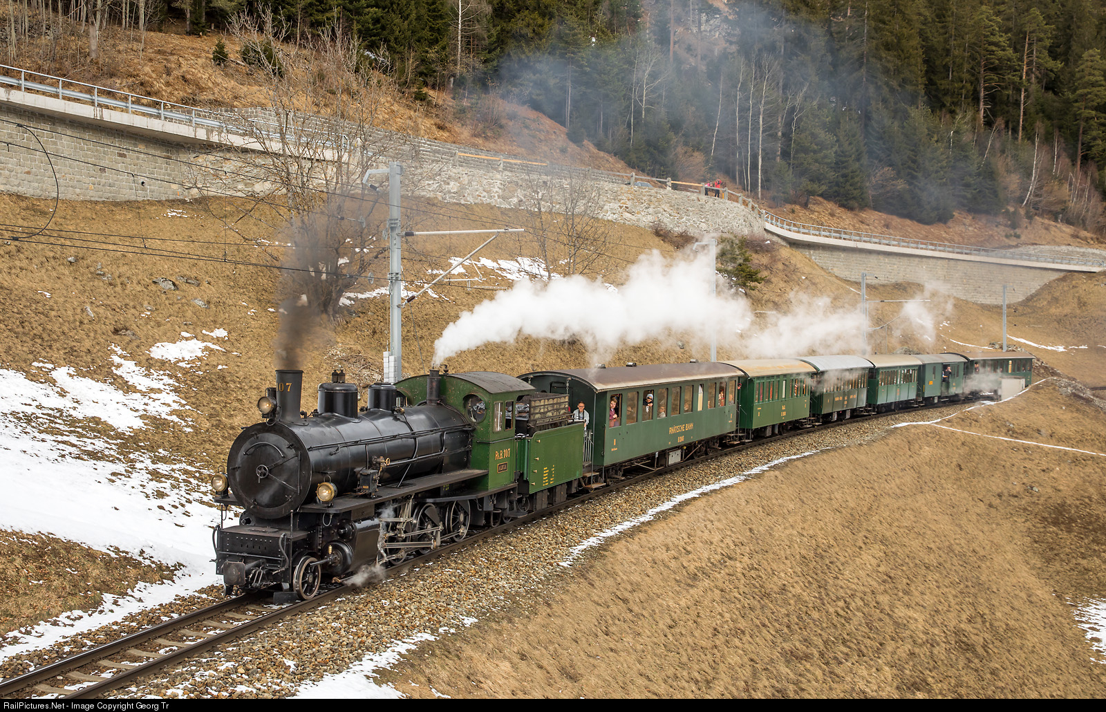 | No snow and only few steam on the Surselva winter steamtrain from Landquart to Disentis/Mustér. The 2-8-0 "Consolidation" G 4/5 # 107 "Albula" from 1906 is pulling the train 2725 near Disla, between Sumvitg-Cumpadials and Disentis/Mustér. |