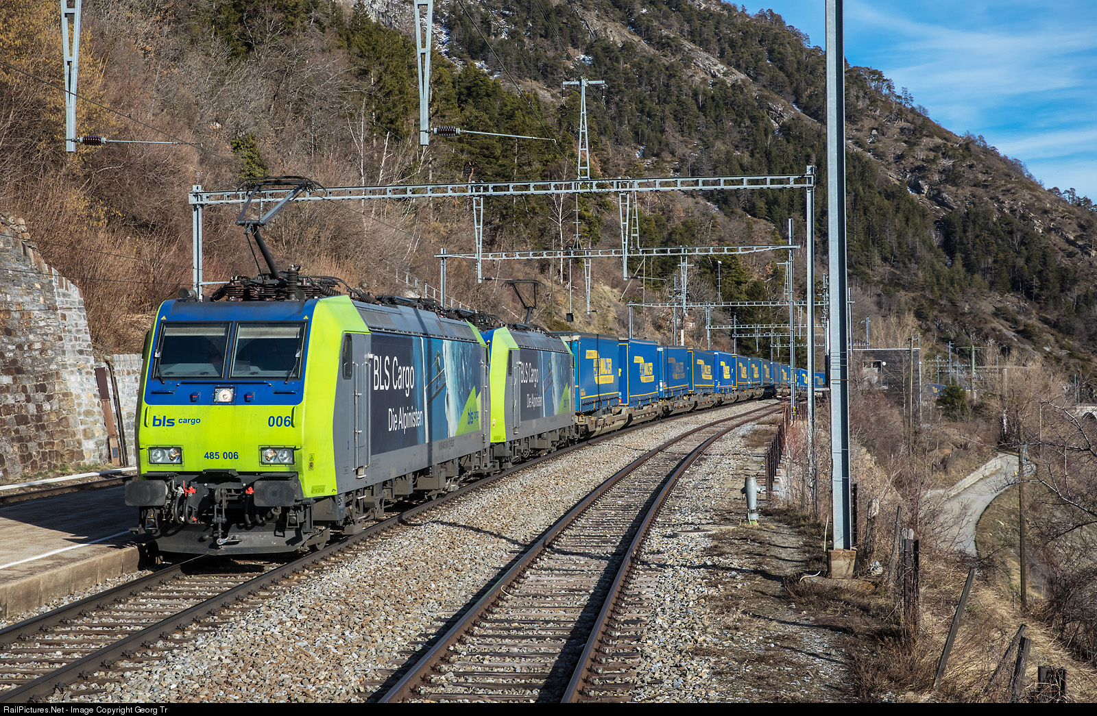 | Re 485 # 006 and another of the same series of the BLS Cargo (Bombardier TRAXX F140 AC1 built 2004) are pulling the LKW Walter forwarder train 43540 from Padua Interporto/Italy via the Simplon and Lötschberg mountain line-Basel to Geleen-Lutterade/Netherlands through Hohtenn. In the rear of the train is the brown Re 425 # 180 of the BLS pushing. |