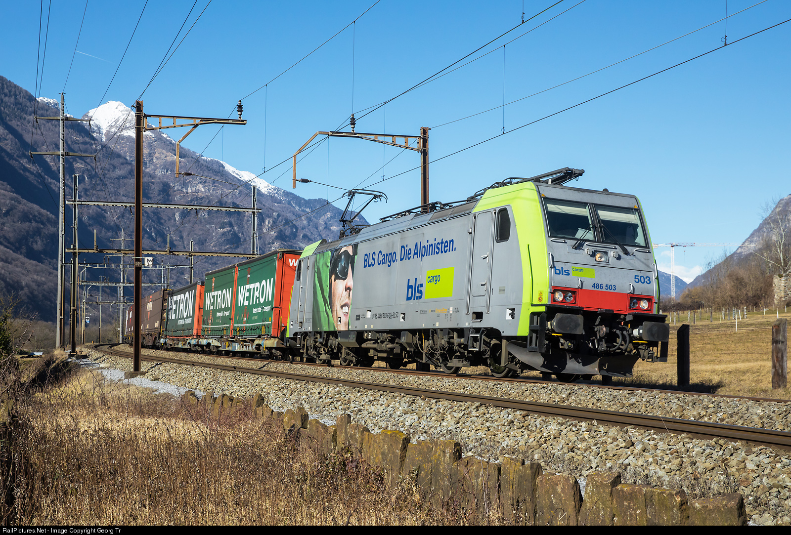 | Re 486 # 503 of the BLS Cargo (Bombardier TRAXX F140 MS) is pulling the southbound "Wetron" intermodal train 41073 from Krefeld-Uerdingen/Germany to Melzo Scalo/Italy on the Gotthard line south of Claro. |