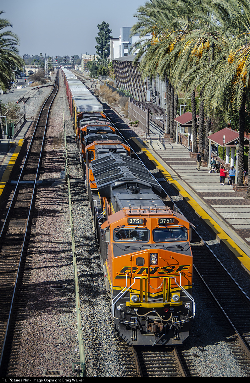 Holding on Track 2, waiting for a clear signal indication (a hot eastbound intermodal train just overtook it on Track 1), is BNSF ET44C4 3751 and its train – the Los Angeles to Barstow freight that originates at the BNSF-owned Los Angeles Junction Railway in Vernon, southeast of downtown LA. BNSF 3751, sharing a number with Santa Fe 4-8-4 3751 (undergoing flue replacement in Los Angeles, just a handful of miles from the LAJ in Vernon), is undergoing some emissions testing and is, as a result, assigned to the Barstow to Los Angeles pool for a while. This train’s full consist is ET44C4 3751, ET44C4 3744, ES44C4 8342 and ES44DC 7755.