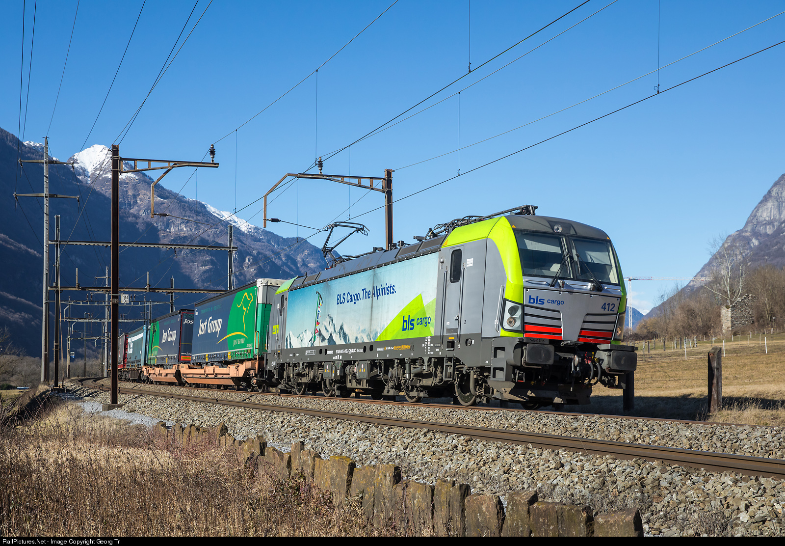 | Siemens "Vectron" Re 475 # 412 of the BLS Cargo is pulling the southbound intermodal train 40105 from Bierset-Awans/Belgium to Piacenza/Italy on the Gotthard line between Claro and Castione-Arbedo. |