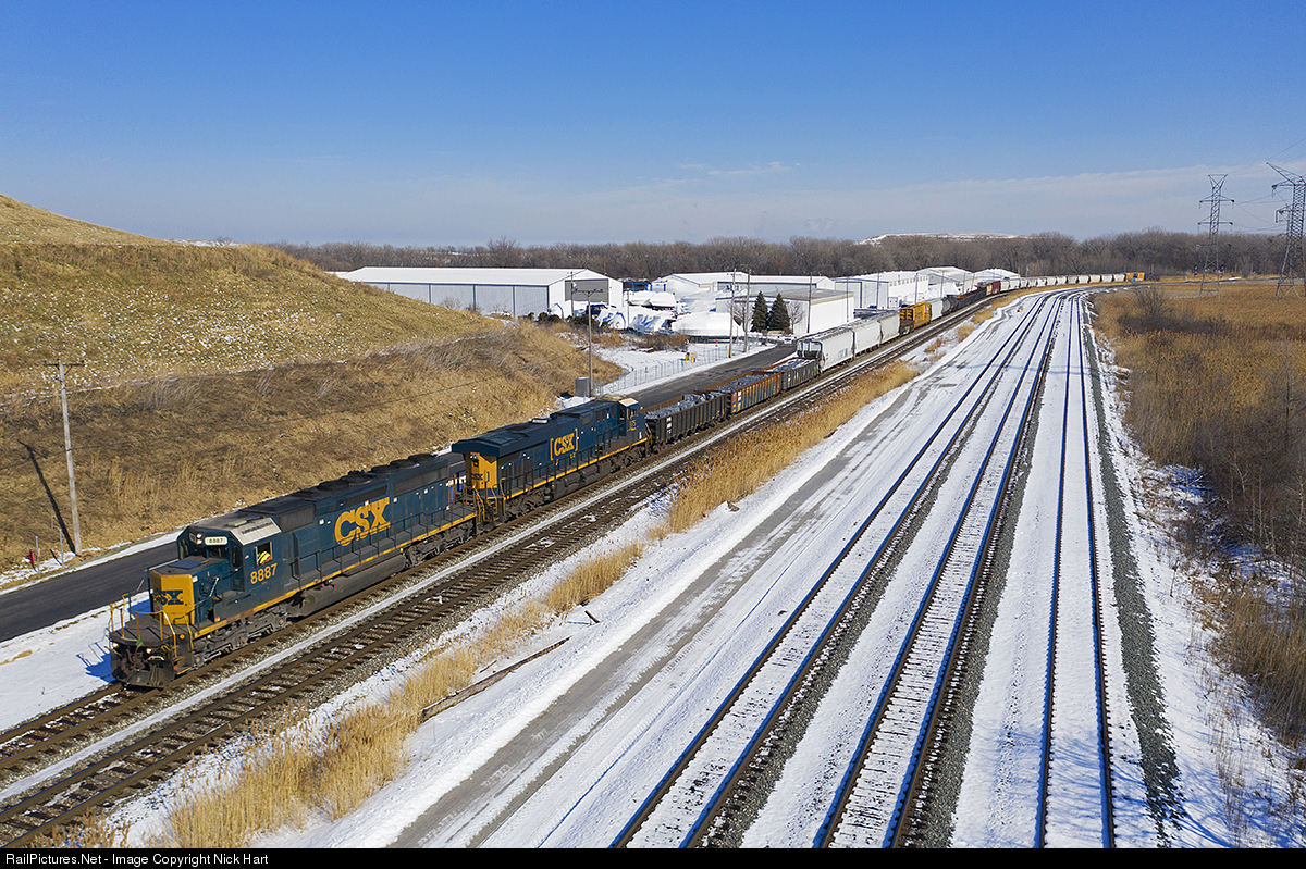 CSXT SD40-2 8887 and ES44AC-H 975 are in charge of a short Q327-16 (Grand Rapids, MI - Chicago, IL) as they slow to a stop at Cottage Grove Avenue, awaiting clearance into Barr Yard. 8887 was built as the CR 6406 in 1977 and is still out leading mainline trains in 2020.