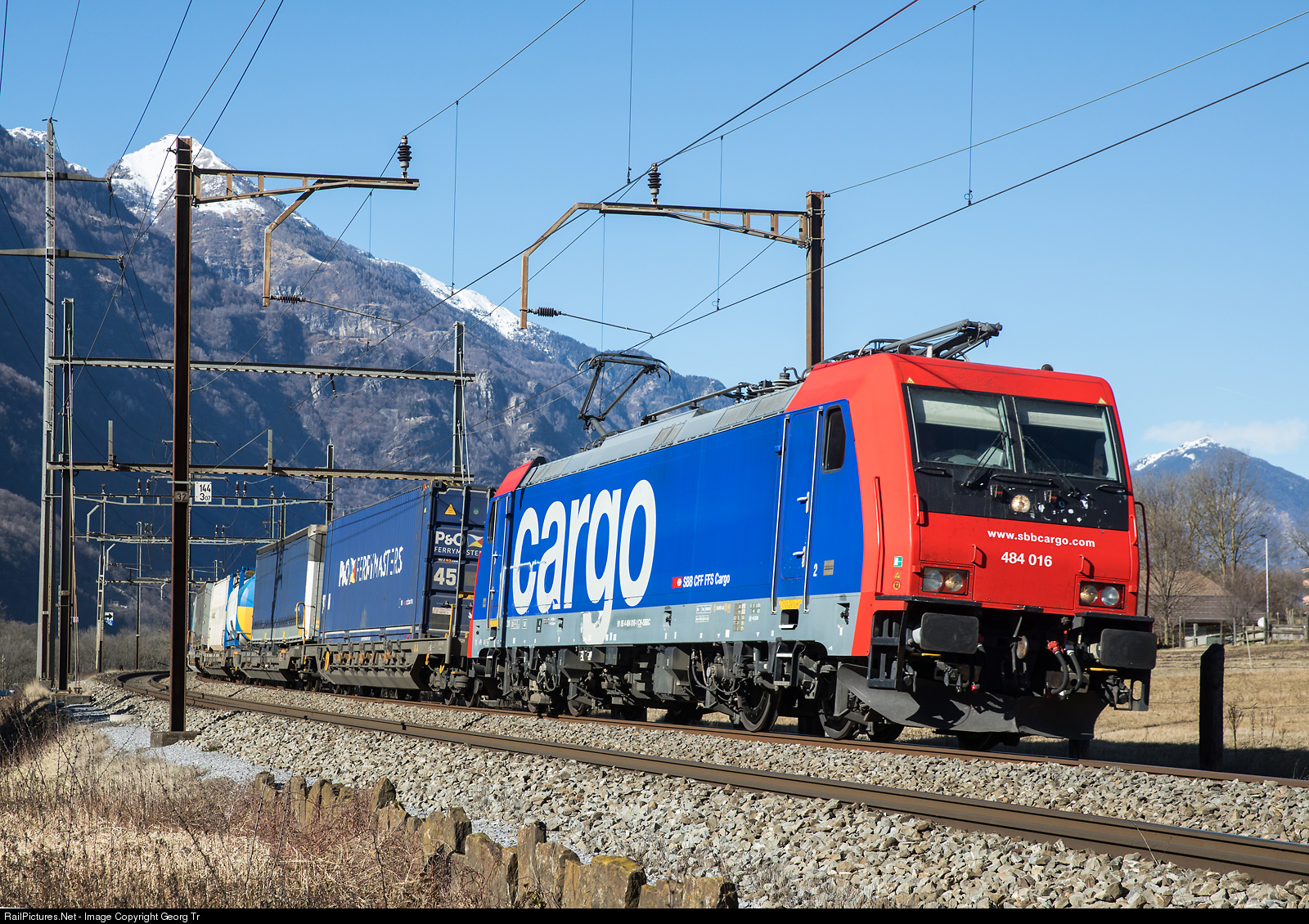 | Re 484 # 016 of the SBB, a Bombardier TRAXX F140 MS built in 2004 and running for SBB Cargo International, is pulling the southbound intermodal train 43075 from Rheinhausen/Germany to Gallarate/Italy (Busto Arsizio Terminal), on the Gotthard line south of Claro.