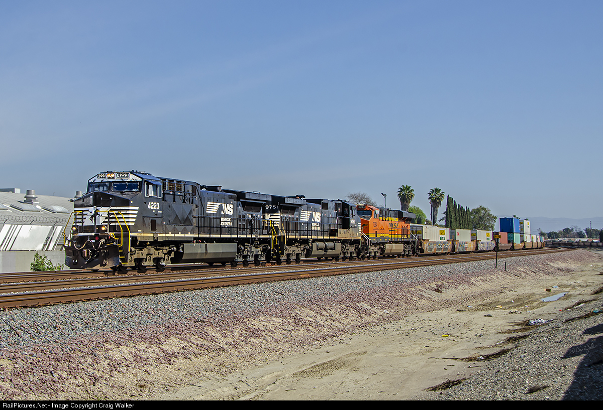 BNSF Railway train Q-NYCLAC6-12 rolls through Basta, a location west of the passenger station in Fullerton, California. A pair of Norfolk Southern diesels (NS AC44C6M 4223 and Dash 9-44CW 9751), along with BNSF ES44DC 7284, are leading this Guaranteed Service Intermodal train, which originated in New York NY and is just about to its final destination of Los Angeles CA. NS 4223 is the former NS Dash 9-44CW 8927, and was converted to AC traction motors, with the new model designated as AC44C6M. (Fullerton, California – February 15, 2020)