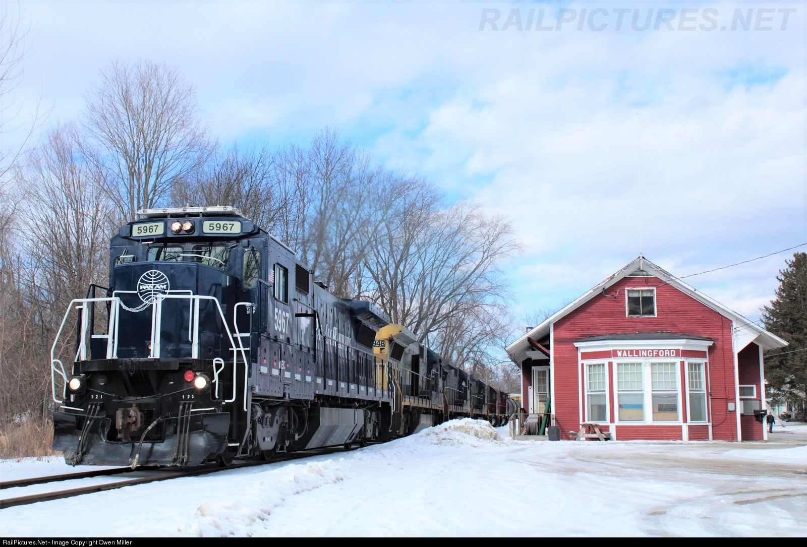 Rerouted PAS 11R is seen heading south on the Vermont Railway B&R division at Wallingford, with blue-dip MEC 5967 on the headpin