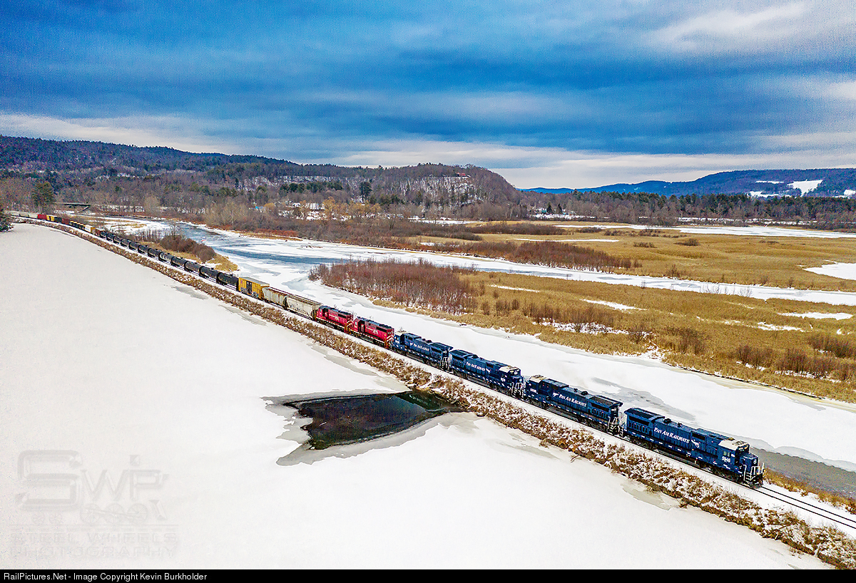 The Sunday, February 16, Pan Am Southern 16R-16 detour train is seen arriving at Riverside Yard in Rockingham, Vermont, with a quartet of former NYSW B40-8s turned MEC 5946, 5936, 5930, and 5943, and Vermont Railway GP40-2 303 with GP40-2L 310.