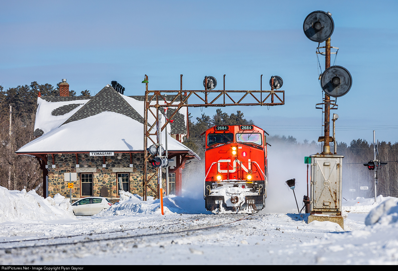 | On the ninth day of the Wet'suwet'en First Nation rail blockade in Ontario - a day after CN announced it would "shut down its Eastern Canada network" - a handful of trains took the scenic route over the Ontario Northland Railway to reach their respective destinations of Toronto (southbound) and Northern Quebec (northbound). Here, detoured CN stack train no. 149 is seen racing southbound along ONR's Temagami Subdivision, kicking up snow by the line's gorgeous namesake station. |
