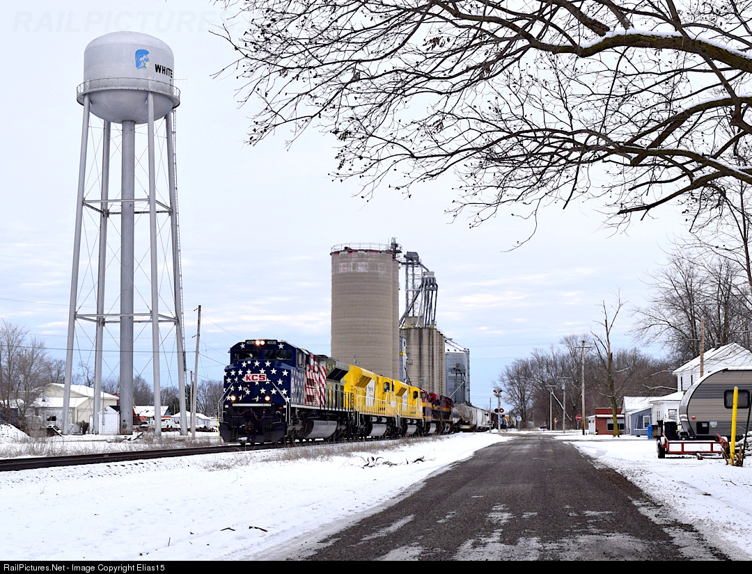 | KCS 4006 for the third week in a row leading MVNKC North on a Saturday in Central IL. This train runs from Venice, IL to the KCS Murray Yard in Kansas City. Here he is leading the train North through the small town of White Hall, IL on the KCS Godfrey Sub. As it is very visible the train had two of the Progress Rail SD70ACE-T4 units trailing. KCS has a handful of these units scattered across their system. |